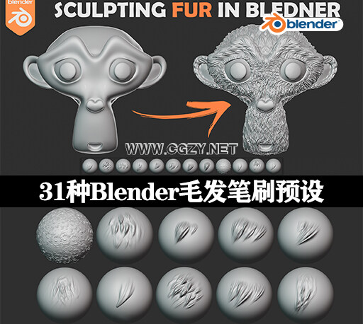Blender插件|31种毛发笔刷预设 Sculpting Fur And Hair Brushes