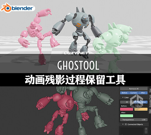 Ghostool是一个Blender插件,用于在视窗中创建幽灵或洋葱皮,以帮助动画师更快更容易地完成他们的工作。在Blender中给模型动画添加动作残留效果,可以更好的调节动画。
