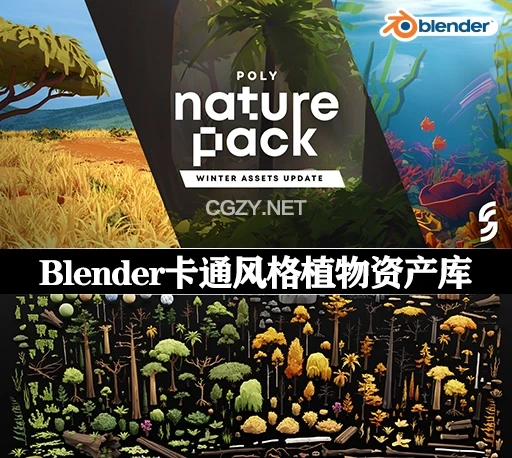 Poly Nature Pack: Animated Stylized Pack是一个Blender卡通动画风格植物资产库。提供了低多边形风格的自然环境资产,包括树木、灌木、岩石等,适合制作卡通或风格化的3D环境。特别适用于环境设计和生物群落创建,并且支持动画效果,尤其是对于植物和树木的风动动画。