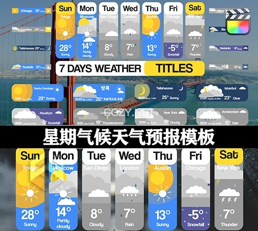 可用于制作整个星期的天气提供报告。该模板可根据您的视频进行定制,包括自定义颜色和文本,您可以将其用于电视、在线平台或教育内容的天气预报广播。其多功能性适用于各种媒体格式,使天气预报清晰、现代且视觉吸引力十足。