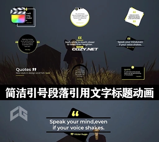 videohive 37174062 Quotes Titles是一款包含了9种简约实用的段落引用文字标题动画FCPX模板,支持M1芯片,支持中英文输入,可自定义修改颜色。