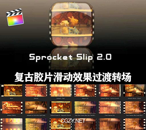 Sprocket Slip 2.0是一套很流行的FCPX复古风格胶片滑动效果的过渡转场,此为2.0版本,包含了22种预设,原生支持M1,并可调节时长等参数,简单易用。