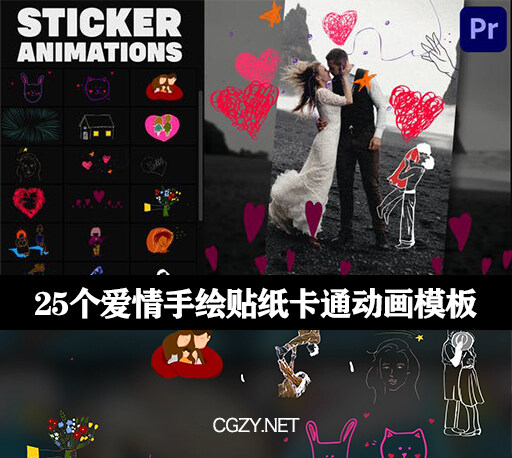 25个浪漫爱情手绘贴纸卡通动画PR模板下载-Love Lyric Animations 02