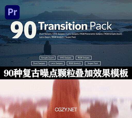 PR模板|90种复古噪点灰尘颗粒叠加无缝转场模板-Transition Pack