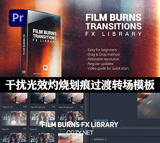 Premiere Pro电影胶片炫光漏光光效转场预设模板+音效 Film Burns Transitions & FX Pack