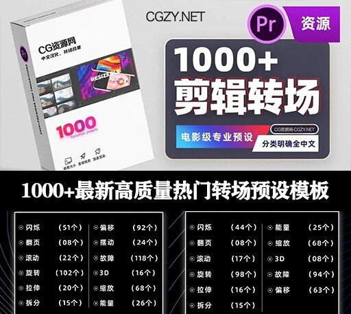PR模板|1000种热门影视剪辑汉化转场预设模板合集包+PR安装使用教程