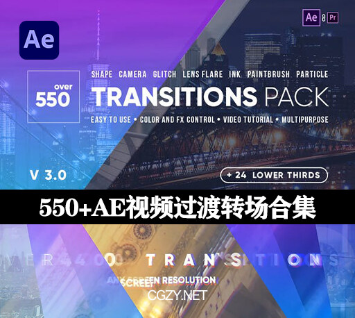 AE模板|550+AE视频信号干扰缩放光晕水墨画笔粒子光效图形遮罩视频转场模板-Transitions V3