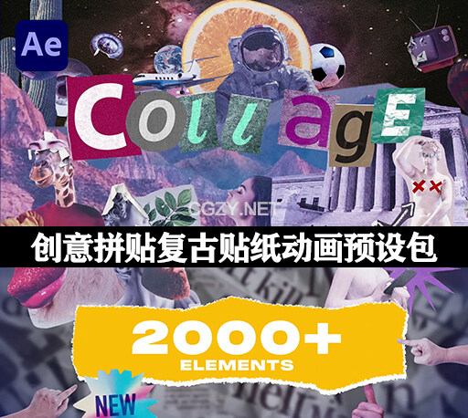 AE脚本|2400组创意动物食物风景交通花朵植物嘴鼻眼睛手脚头发日常物品复古定格贴纸动画AtomX预设 Collage Pack V5