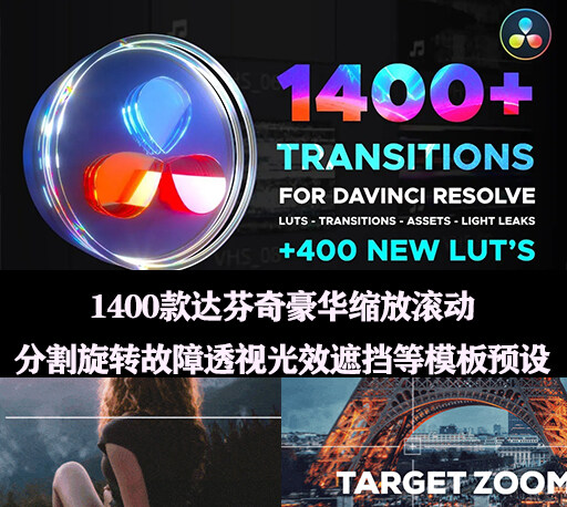 达芬奇模板|1400种豪华缩放滚动分割旋转故障透视光效遮挡无缝转场LUT调色音效预设-Transitions Library for DaVinci Resolve
